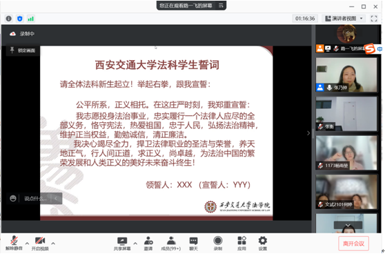 最后,丁卫副院长祝愿大家度过美好的学习生活,随后带领全体新生庄严宣誓:“公平所系,正义相托。在这庄严时刻,我郑重宣誓:我自愿投身法治事业,忠实履行一个法律人应尽的全部义务,恪守宪法,热爱祖国,忠于人民,弘扬法治精神,维护正当权益,勤勉诚信,清正廉洁。我决心竭尽全力,捍卫法律职业的圣洁与荣誉,养天地正气,行人间正道,求正义,尚卓越,为法治中国的繁荣发展和人类正义的美好未来奋斗终身!”