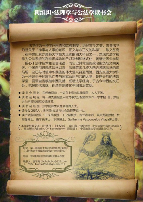 基于以上种种考量,并配合学校“思想交大”建设和学院法理学和公法学的学科建设,乐鱼页面在线登录“立法与社会治理研究中心”发起创办“利维坦·法理学与公法学读书会”系列活动。本学期该活动选取的经典文本为让·博丹的《主权论》,并于10月18日晚7时在学院会议室举行了首场活动,乐鱼页面在线登录丁卫副教授、吉兰湘老师、彭何利博士、苏青博士、王朝恩博士、卞苏博士、唐学亮博士等10余位师生参加。主权理论是现代民族-国家兴起的理论前提,而民族-国家又是现代社会最重要的一个政治与法律现象,并与中国近代以来持续至今的伟大而艰难的国家转型勾连起来,因此,不得不察。在该场读书会活动中,主讲教师唐学亮针对博丹《主权论》一书的“导论”部分,就“为什么读博丹?”、“怎么读博丹?”、“博丹的思想里程与理论建构”以及“博丹理论的缺陷”等四个方面做了一个提纲挈领而又不失理论深度的学术报告。之后,就报告的内容及书中所启示的一些重大理论与现实问题,与会人员各自发表了自己的看法,并展开了热烈的讨论。首场读书会活动取得了预期的效果,我们将在两周后的同一时间举行第二场活动。“路漫漫其修远兮,吾将上下而求索”!