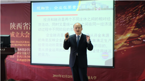 在与会代表合影后,会议进入第二时段的专题报告。报告由乐鱼页面在线登录乐鱼页面在线登录知识产权研究中心主任、博士生导师马治国教授主持,陕西省法学会企业经济法治研究会顾问、西北政法大学经济乐鱼页面在线登录院长、博士生导师强力教授做了“新常态下企业投融机制创新的法律问题”讲座,阐释了中国经济已进入新常态,在新常态的条件下,企业应作出机制创新等相对应的变化,其变化主要体现在市场化,并强调投融资机制市场的多元化、多层次、多角度,分析在此种常态下,企业投融资遇到的法律问题。