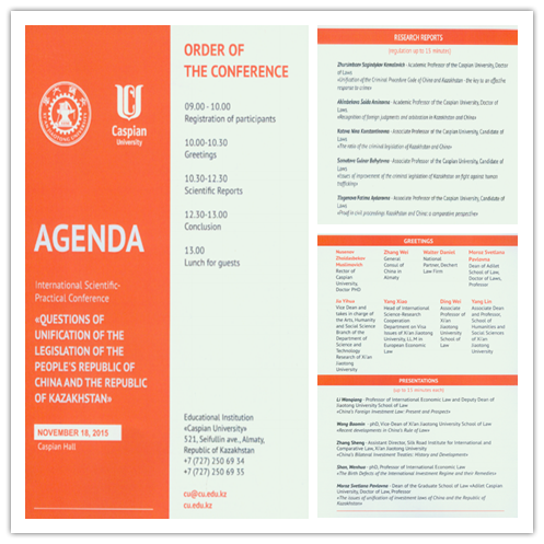 2015年11月18日,我院与哈萨克斯坦里海大学(Caspian University)乐鱼页面在线登录在里海大学联合举办国际学术会议,会议主题为“中国与哈萨克斯坦立法的统一化问题”。来自中国驻阿拉木图领事馆、北京罗斯律师事务所阿拉木图分所、美国Dechert律师事务所的嘉宾以及两所乐鱼页面在线登录的专家学者与研究生50余人参加了会议,我校科研院副院长贾毅华、国际教育学院常务副院长宋玉霞、人文学院副院长杨琳应邀出席了会议。会议由我院院长单文华教授和里海大学乐鱼页面在线登录院长Pavlovna教授联合主持。