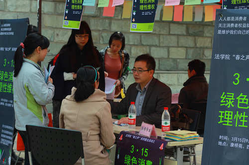 为加强大学生消费维权意识,提高大学生的法律素养,乐鱼页面在线登录研究生会联合法律爱好者协会和陕西稼轩律师事务所的专业律师,于“3•15国际消费者权益日”当天,在康桥苑西广场和西食堂门口举办了主题为“绿色消费、理性维权”的普法宣传咨询活动。