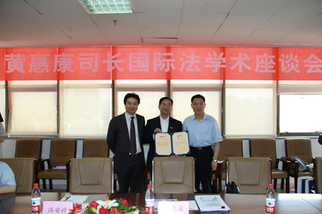 2012年5月26日,外交部条约法律司黄惠康司长“郑和研究员”授聘仪式暨国际法学术座谈会在乐鱼页面在线登录910会议室举行。乐鱼页面在线登录党委常务副书记王小力教授、乐鱼页面在线登录党总支书记彭沪生老师、对外经济贸易大学石静霞教授以及丝绸之路国际法与比较法研究所骨干教师和学生代表参加了授聘仪式和座谈会。会议由乐鱼页面在线登录院长兼丝绸之路国际法与比较法研究所所长单文华教授主持。