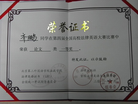 此次比赛吸引了来自北京大学、上海交通大学、中国政法大学、华东政法大学等近70多所高校乐鱼页面在线登录的选手参加,大会主办方特别邀请了国务院法制办原主任孙婉钟先生以及来自中国社会科学院法学所、中国人民大学乐鱼页面在线登录等多家高校和研究机构的法律英语专家、教授担纲评委。我院齐鹏同学撰写的英语论文《National Treatment Principle For China's Bilateral Investment In The New Period》在此次大赛中经过激烈角逐荣获国家一等奖,是此次参赛西北地区唯一获得等级奖的论文。