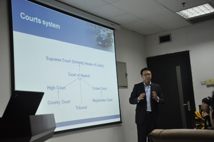 报告期间,陈易凡律师结合他在英国学习法律和执业的亲身经历和切身体会,为我院师生讲解英国的法律制度和法律教育体系,并且积极和同学们进行互动交流。陈律师首先介绍了英国的司法系统;其次,他介绍了英国的法律教育体制和律师制度;最后,陈律师总结了自己的执业经验,希望对同学们有所启发。在提问环节,陈律师耐心地回答了同学们提出的问题。其幽默风趣的演讲赢得在场同学的掌声。