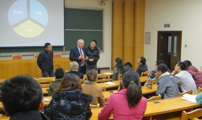 访问期间,安德森大法官面向全校师生做了两场精彩报告。第一场报告以“美国大法官论美国法律体系:联邦和州宪法,刑法,和司法系统的责任”为主题,在主楼A103举行。安德森大法官用其生动的方式和幽默的语言为我院师生讲解,并且在现场积极地和师生进行交流,通过和师生互动的方式让大家更好地理解报告的主题。