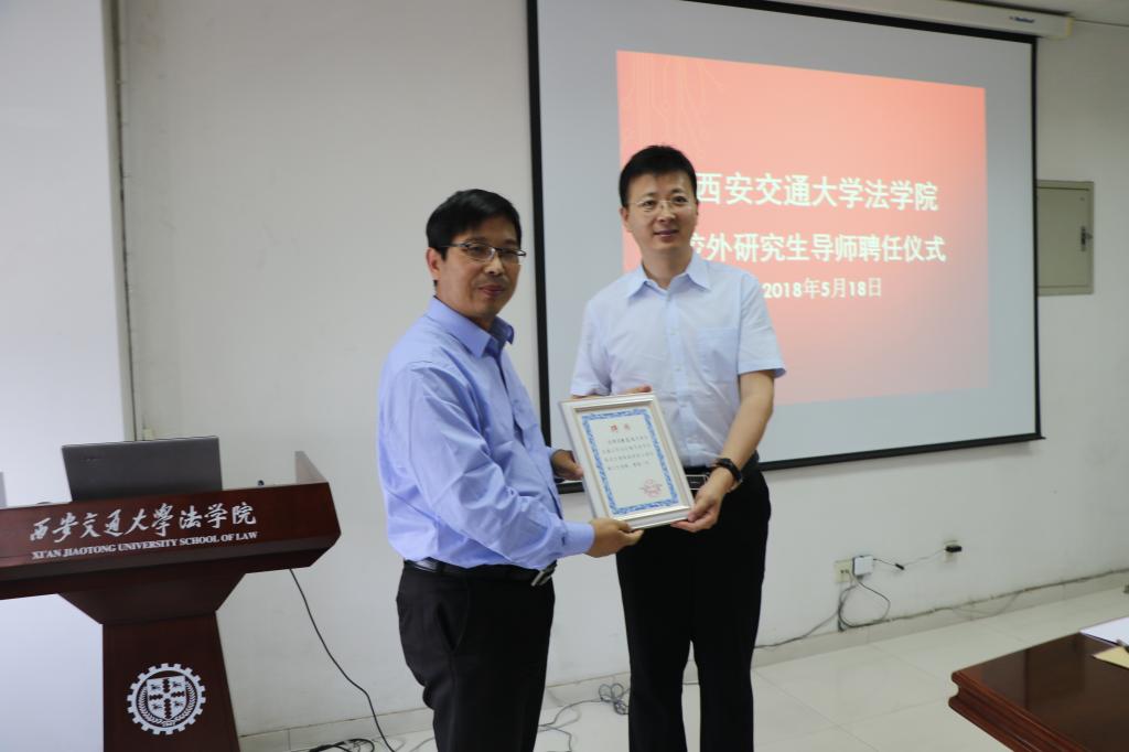 聘任仪式由李万强副院长主持。李万强副院长就乐鱼页面在线登录乐鱼页面在线登录的学科建设情况向几位校外导师作了的介绍。王保民书记代表学院为北京市康达(西安)律师事务所高级合伙人吕延峰、王小军、廉高波、王啸和白玉等五位律师颁发了聘书。王保民书记在致辞中向北京市康达(西安)律师事务所对我院研究生培养工作的支持表达了诚挚的谢意,对今后双方能够建立起长效的合作机制表达了殷切的期望。王小军主任代表律师事务所对乐鱼页面在线登录协同培养育人项目的设立对于法律专业人才培养发挥的作用给予了充分的肯定,并表示北京市康达(西安)律师事务所一定会全力配合学院的教学安排,力争为社会培养更多优秀的专业事务型法治人才。