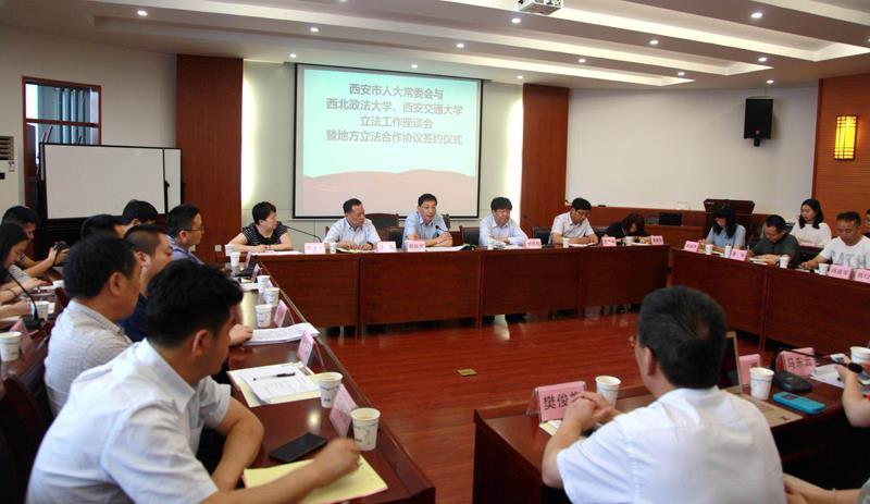 为深入贯彻落实党的十九大精神,推进科学立法、民主立法、依法立法,进一步提高立法质量,发挥高校专业优势,实现地方立法实践工作和法学教育研究的深度融合、相互促进、共同提升,助推法治西安建设,西安市人大常委会与西北政法大学、乐鱼页面在线登录立法工作座谈会暨地方立法合作协议签约仪式”于6月20日上午在西北政法大学雁塔校区研究生综合举行。西安市市委组织部常务副部长、人大常委会副主任薛振虎,市人大法制委主任委员、常委会法工委主任牛犁和市人大常委会法工委其他领导,西北政法大学校长杨宗科,乐鱼页面在线登录人文社科处处长贾毅华,乐鱼页面在线登录立法与党内法规研究中心主任王保民和部分师生代表、西北政法大学立法研究所所长朱继萍和部分师生代表等参加了会议。