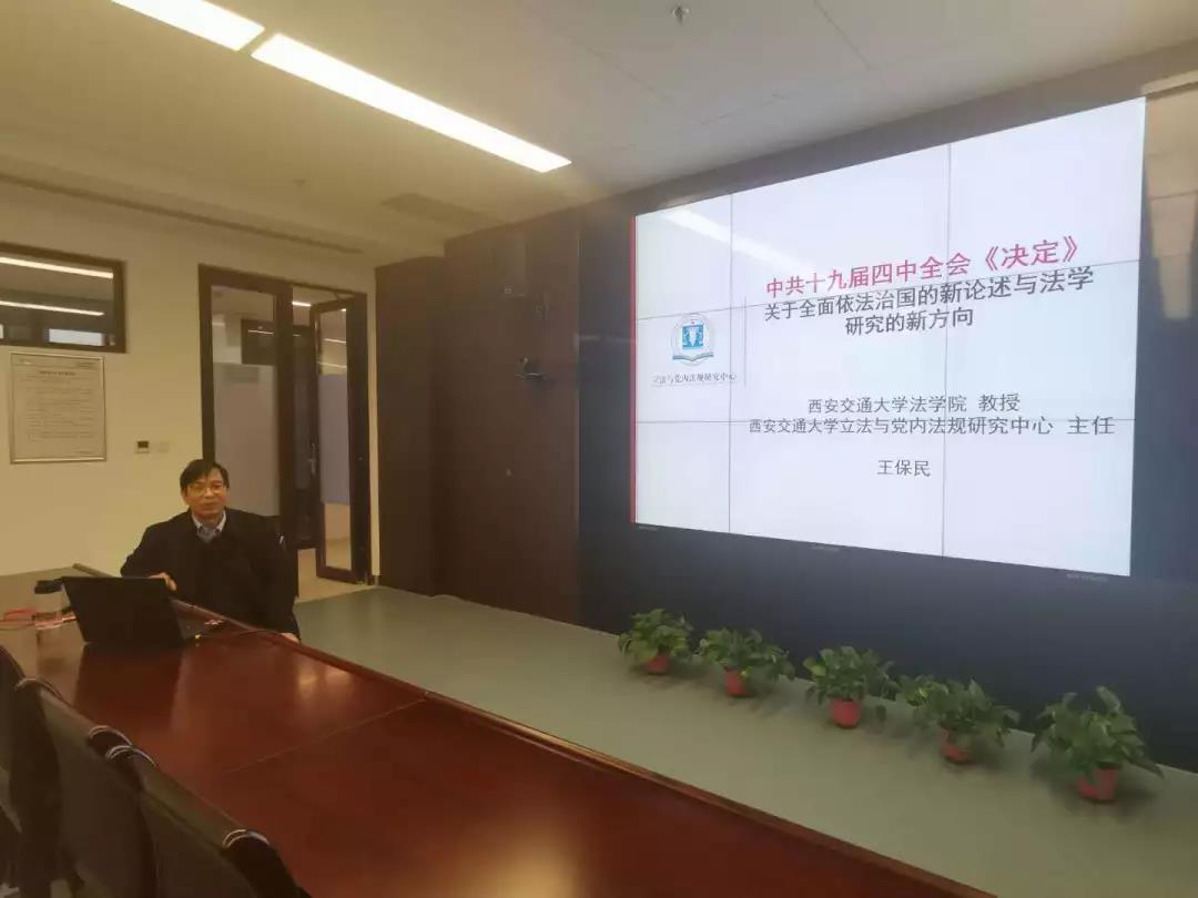 12月12日,乐鱼页面在线登录创新港系列学术讲座之“十九届四中全会关于全面依法治国的新论述与法学研究新方向”在创新港5号巨构10087教室顺利举行。乐鱼页面在线登录乐鱼页面在线登录党总支书记、乐鱼页面在线登录立法与党内法规研究中心主任王保民教授围绕中共十九届四中全会召开的基本情况和重要意义、《决定》中的高频词汇和理论亮点、《决定》关于全面依法治国的新论述、法学研究的新方向新热点等五个方面做了专题讲座。