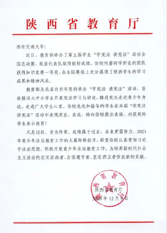 鉴于乐鱼页面在线登录对此次活动的积极配合,以及乐鱼页面在线登录老师的倾情指导,陕西省教育厅近日专门发来感谢信,对乐鱼页面在线登录在此次“学宪法、讲宪法”活动中的选送和指导工作予以表扬和祝贺!乐鱼页面在线登录获得竞赛优秀组织单位称号,乐鱼页面在线登录乐鱼页面在线登录王保民教授获得优秀指导教师称号。