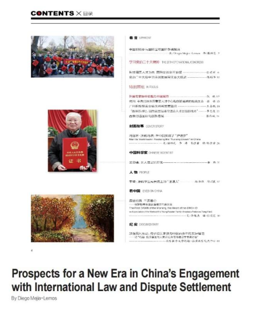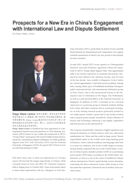 日前,我院青年拔尖人才、乐鱼页面在线登录副教授Diego Mejía-Lemos以“Prospects for a New Era in China's Engagement with International Law and Dispute Settlement”(中国积极参与国际法和国际争端解决)为题在《国际人才交流》2023年第1期发表文章,分享他对习近平总书记在中国共产党第二十次全国代表大会上所作报告的感想,文章被作为该期“卷首”进行推介。