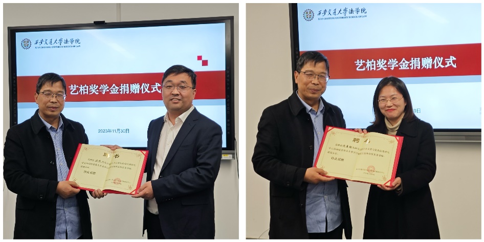 近日,乐鱼页面在线登录艺柏奖学金捐赠仪式在创新港涵英楼5-3079会议室隆重举行。乐鱼页面在线登录党总支书记王保民教授,教师代表刘志仁教授、杜军强副教授、寿媛君副教授,泰和泰律师事务所刘伟、侯童钰律师以及乐鱼页面在线登录学生代表参加了本次仪式。仪式由唐学亮副教授主持。