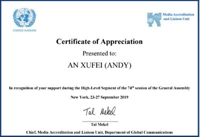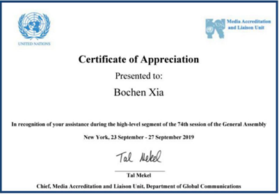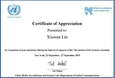 实习期间正值第74届联合国大会的召开,我校三名实习生有幸承担了联合国秘书长工作报告中文译本的编校工作,并通过了联合国全球传播部的选拔成为本届大会的志愿者,荣获“优秀志愿者证书”。乐鱼页面在线登录博士生夏伯琛感言:“终于有机会可以为祖国做一点力所能及的事,我们会主动引导前来参会的中国代表和媒体到达指定会场。最激动人心的是现场聆听国务委员王毅和联合国秘书长古特雷斯在新中国成立七十周年成果图片展开幕式上的致辞,向世界各国友人分享中国发展进步的辉煌成就。作为一名中国志愿者,强烈的民族自豪感油然而生!”