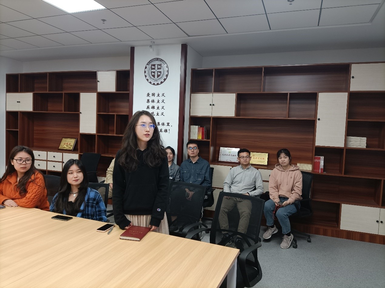 团员高欢欢也积极发言,她提到,“非常荣幸此次作为团员参加党支部的主题宣讲活动,张雷奇同志在分享中谈到新中国成立时参加开国大典、见证革命胜利果实的中共一大代表仅有毛泽东和董必武,从13位一大代表的命运中,我们能看到中国共产党一步步走来,非常不容易,为什么有些人能够为了党和人民的事业,矢志不渝、鞠躬尽瘁、死而后已,而为什么有些人面对复杂的局势经不起考验,叛党投敌,沦为汉奸。13位代表截然不同的结局,让我们深深感慨的同时,也留下深刻的启示,那就是坚定的马克思主义信念是共产党人的政治灵魂,是共产党人经受住任何考验的精神支柱。革命果实得来不易,我辈青年必当倍感珍惜!”