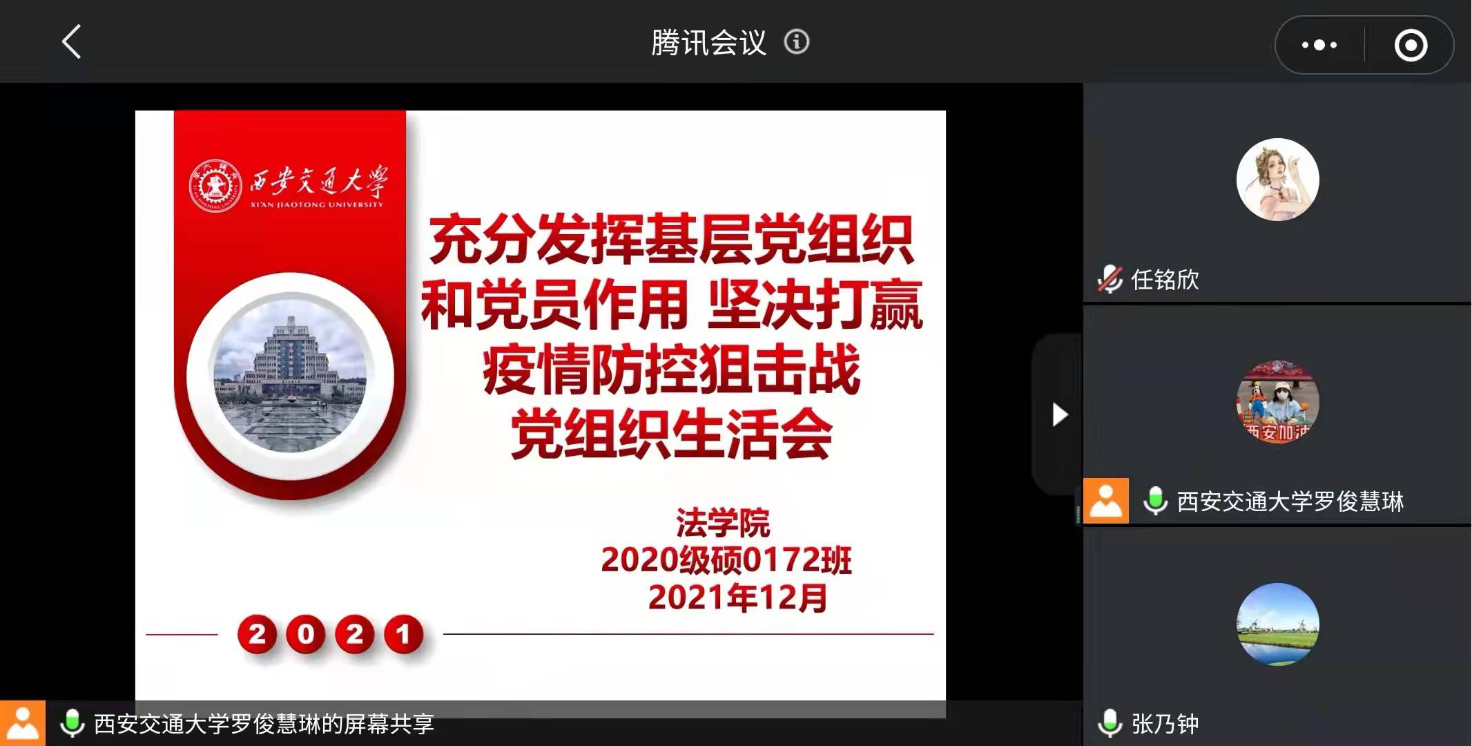 2021年12月30日晚,乐鱼页面在线登录硕0172党支部在线上召开了以“充分发挥基层党组织和党员作用 坚决打赢疫情防控狙击战”为主题的党组织生活会。会议由硕0172党支部书记罗俊慧琳主持,乐鱼页面在线登录党总支委员张乃钟老师出席,支部全体党员以线上方式参加了本次会议。