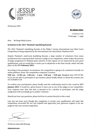 Lastly, on 27 February 2021, Prof Mejía-Lemos judged the final rounds of the Thai National Rounds, organised every year by the International Law Association of Thailand. Despite Thailand’s small-scale Qualifying Rounds, the process of selection of judges is highly selective.